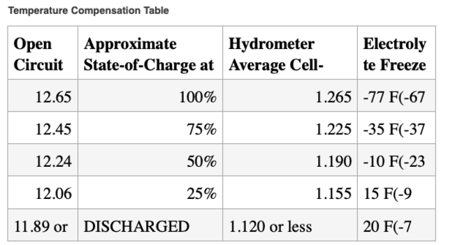 To determine the battery’s state-of-charge with the battery’s electrolyte temperature at 80 F (26.7 C), use the following table. The table assumes that a 1.265 specific gravity cell average and 12.65 VDC Open Circuit Voltage reading for a fully charged, wet, lead-acid battery.